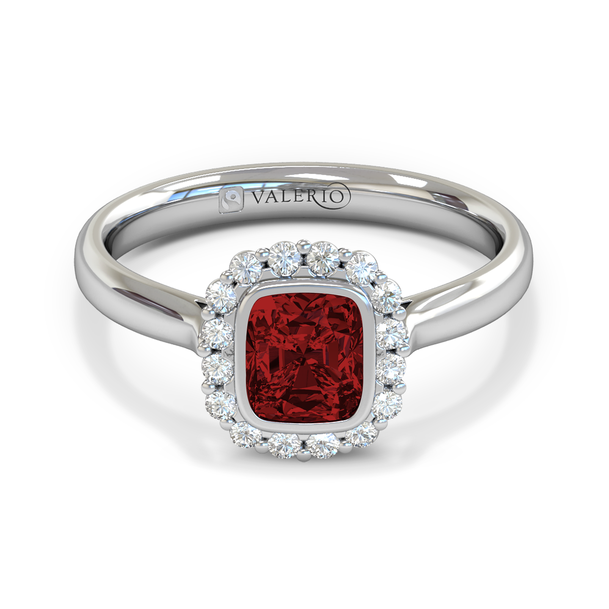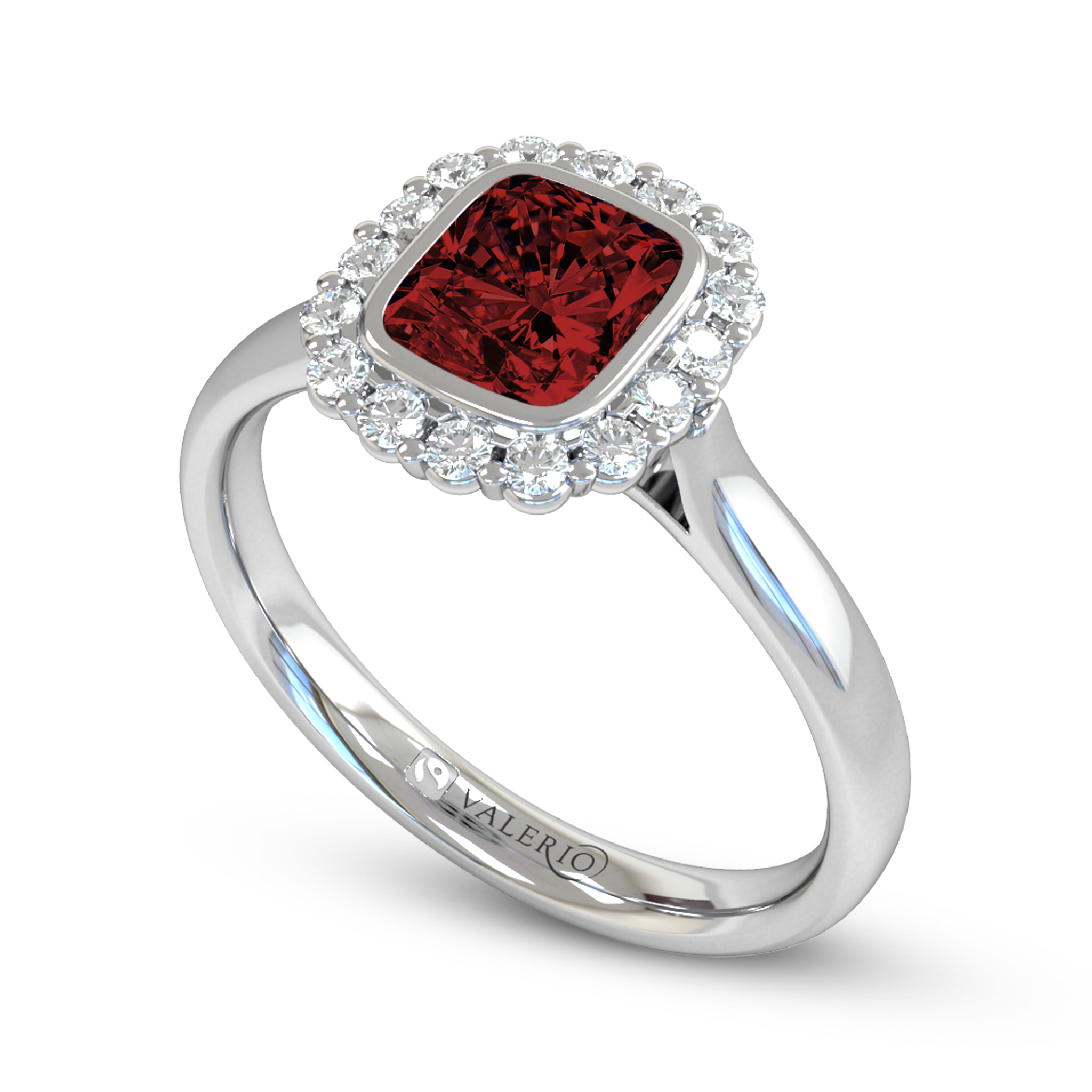 Exclusive cushion cut Greenland Ruby is embraced by traceable diamonds and set in 18k Fairtrade Gold. Our Greenland Rubies are sourced, cut and polished by local artisan Greenlandic peoples. Each stone is cut individually so prices and weights may vary seasonally.