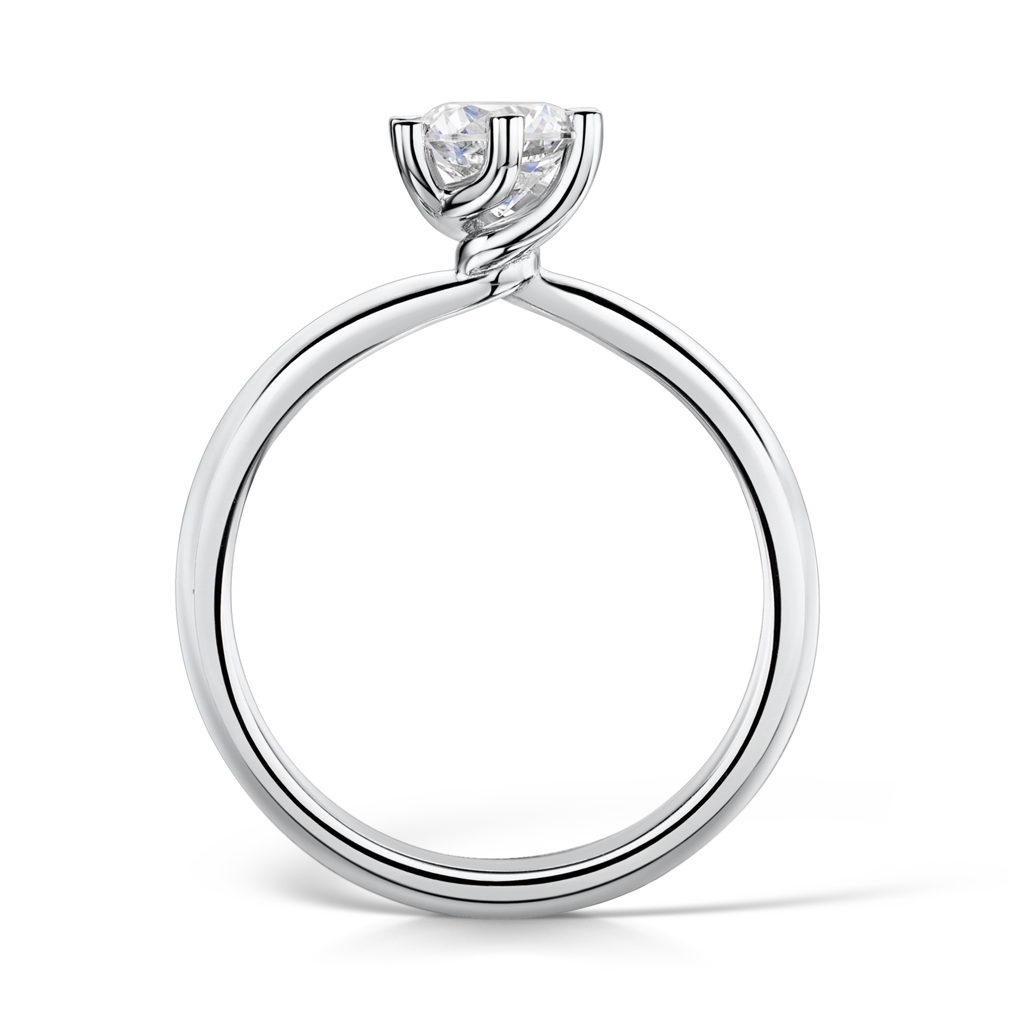 Single Diamond Fairtrade Gold Engagement Ring. An elegant six claw setting with a twist makes for the nest for that one carat diamond. Available in three colours of 18k Fairtrade Gold, yellow, white and rose.