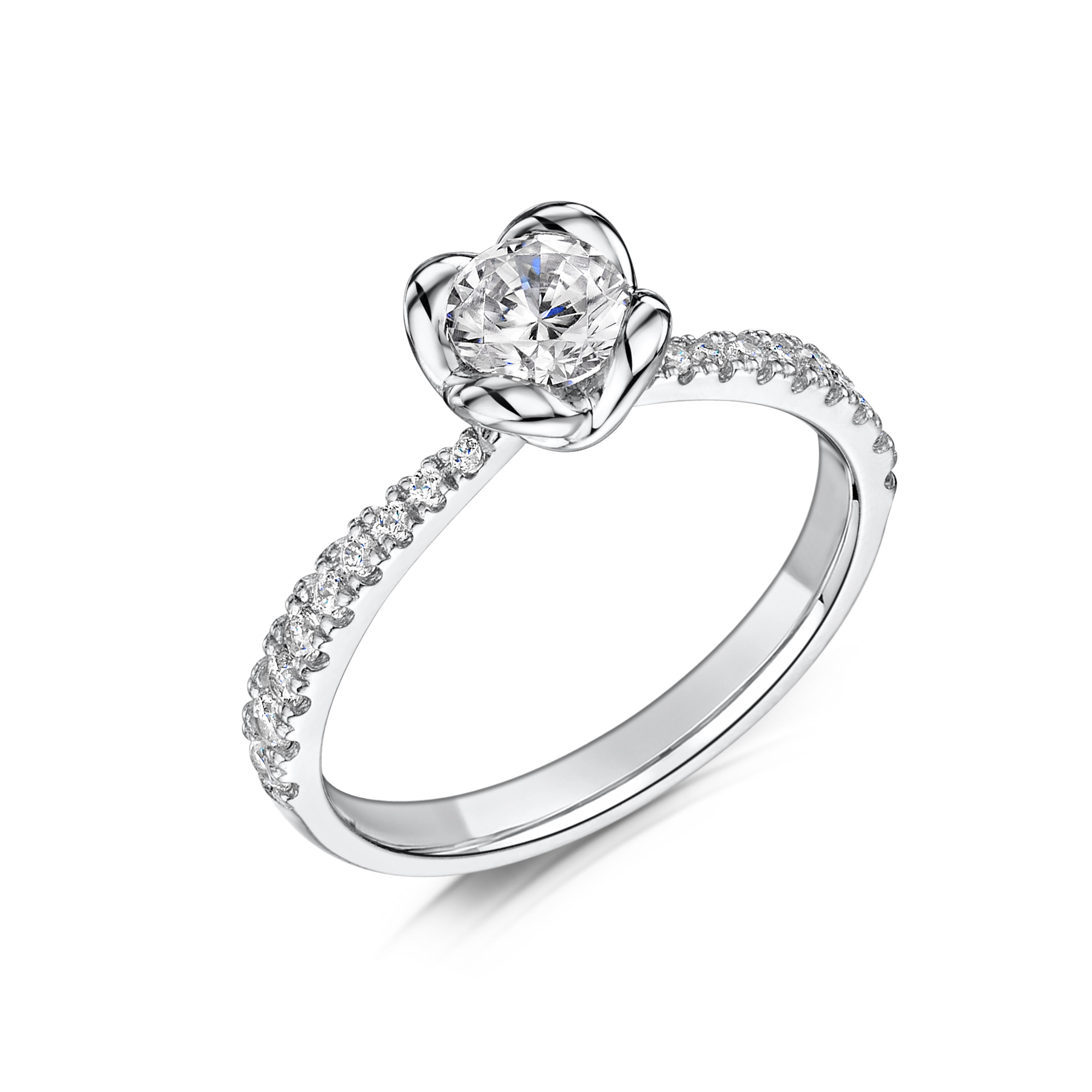 Solitaire Diamond Fairtrade Gold Engagement Ring with gradated diamonds in a scallop setting. All our diamonds are fully traceable from mine too retail.